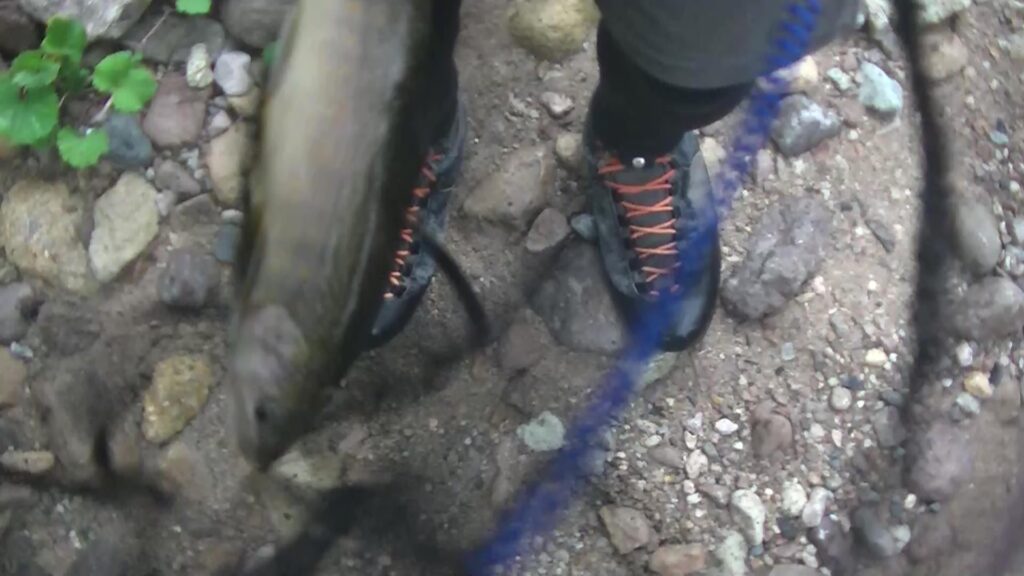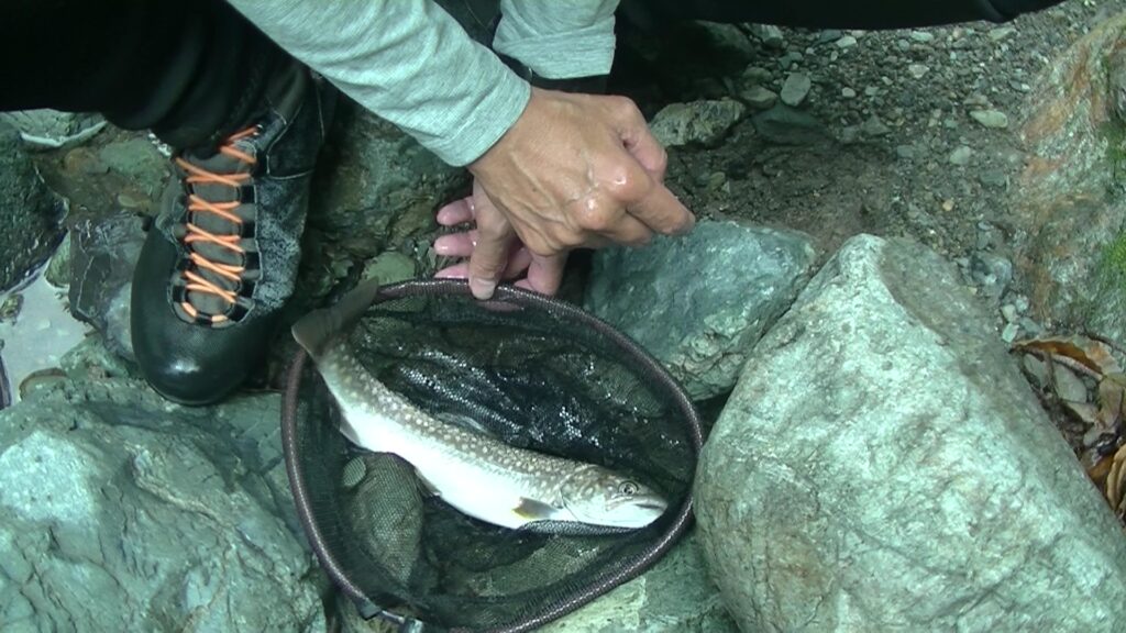その後、本流を釣り上がって行くと、エサのナカガワさんはコンスタントに釣果をあげていくも私の毛鉤への反応は芳しくありませんでした(ちなみにここまでの釣果は9対2、小物はリリースです)。