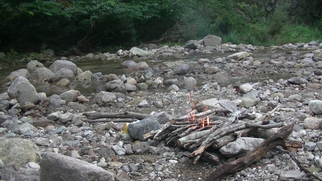 調理場とリビングスペースには焚き火が不可欠であるため、解放的な河原を利用するのですが、今回はこれがテン場の対岸になってしまいました。